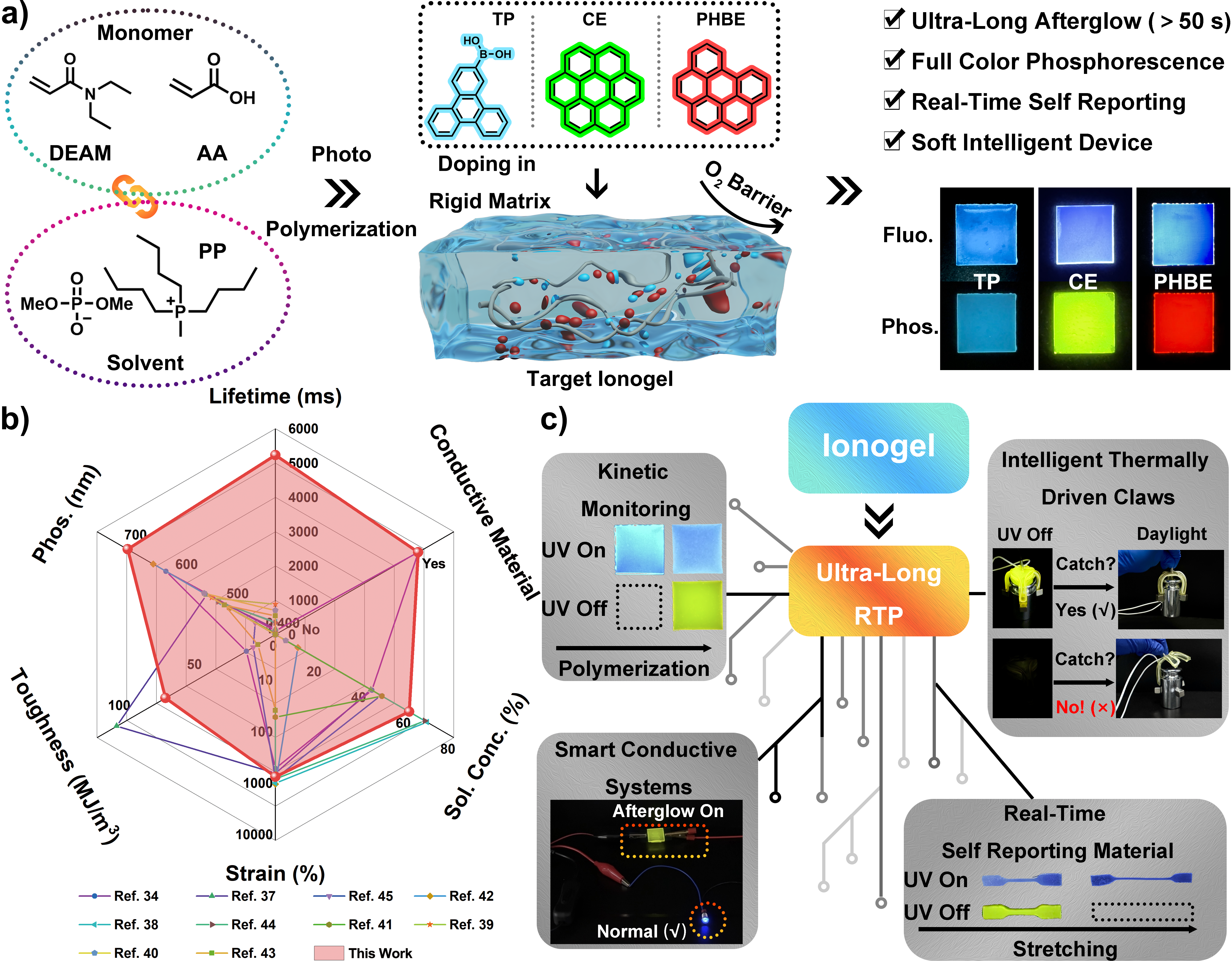 近期,该团队基于离子液体与富氢键聚合物单体之间的多级相互作用成功构建了一系列具有超长室温磷光发射的柔性离子凝胶材料。上述材料在富溶剂环境下(离子液体含量>50%)同时兼具具有优异的机械性能和光学性能:最大应变伸长率接近1000%,最大韧性约为77.11 MJ/m3,在室温下可以表现出接近60 s的超长余辉发射,发光覆盖范围可从深蓝到近红外一区,CIE坐标包括(0.15, 0.18), (0.38, 0.58)以及(0.66, 0.33)。得益于离子液体的优异电学特性、热稳定性以及低挥发性,上述凝胶材料在后续的研究中进一步与智能材料相结合,被成功应用于如工业聚合监测、应力损伤自报告材料、智能导电材料以及智能热驱动夹等一系列具体场景中。该研究开创性的基于全新的离子凝胶体系,构建了一系列兼具高应变-高韧性、长寿命磷光发射的导电柔性材料,并与智能材料领域进行了巧妙结合,从而为柔性有机室温磷光材料的应用前景提供了突破性的指导意见。