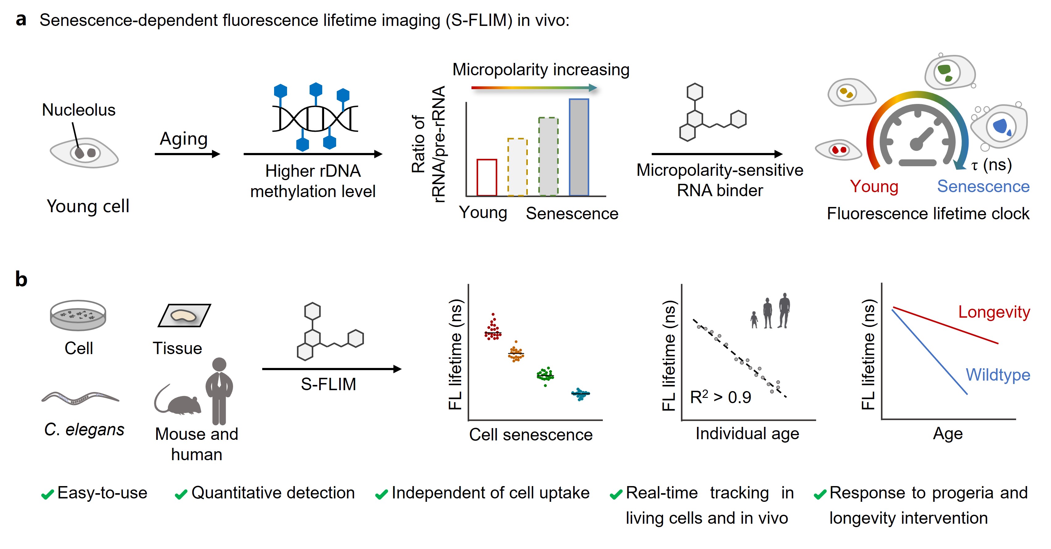 S-FLIM策略中,核心目标染料FLP1在结合rRNA后可产生高达410倍荧光增强,其荧光寿命与核仁微极性线性相关,能够直接反映细胞衰老状态。通过S-FLIM技术,实现了增殖细胞与衰老细胞的有效区分,并能够识别衰老的早期表型,为衰老生物学研究提供了高时空分辨、可视化的新型分析手段。