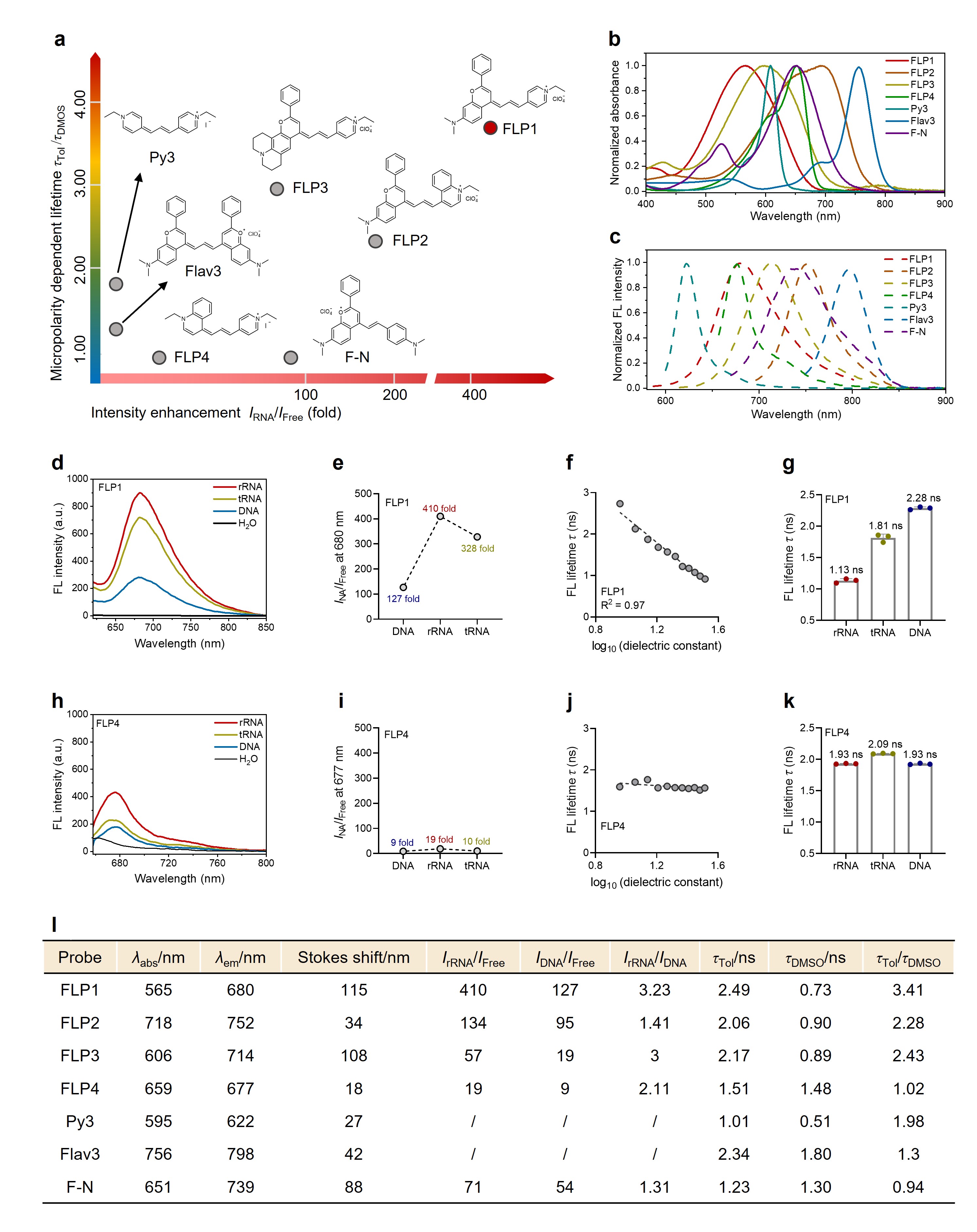该研究工作的主要进展为:(1)分子工程化建立微极性敏感染料:设计并开发不对称黄菁染料FLP1,该染料能高效结合核糖体RNA(rRNA),其荧光寿命对核仁微极性变化表现出高度灵敏的响应特性;(2)实时动态量化:利用荧光寿命成像技术克服传统荧光强度检测易受光照功率、探针浓度等因素影响的局限,实现了对细胞衰老过程的实时、定量化描述;(3)跨尺度应用兼容:无需样本裂解,可在活细胞、组织乃至活体动物水平直接成像,将检测时间缩短至 1.5 小时,显著提升了衰老研究的时效性与实用性。