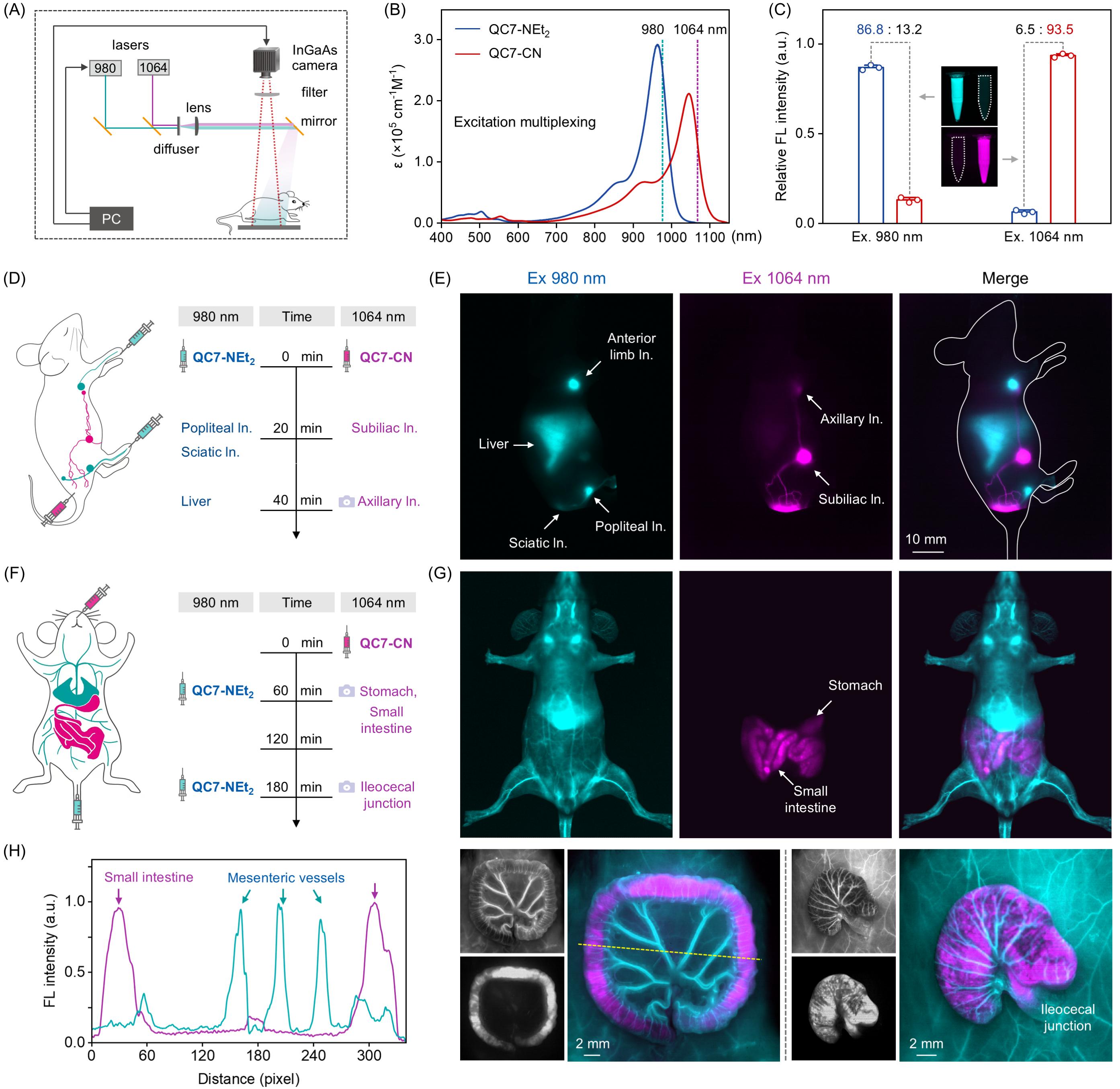 在该系列染料中,QC7-NEt2和QC7-CN表现出超高的荧光亮度(4005 M-1 cm-1),而且光谱分离性能优异,并与商用激光器波长(980 nm与1064 nm)高度匹配,用于多通道活体成像。基于这对“正交”染料,研究团队首次成功捕捉到了血管网络的精细结构及其动态变化、淋巴系统的实时流动、肠道蠕动的完整过程,以及多个生理系统之间的协同作用,为理解在体、复杂生理过程提供了强有力的可视化技术支撑。