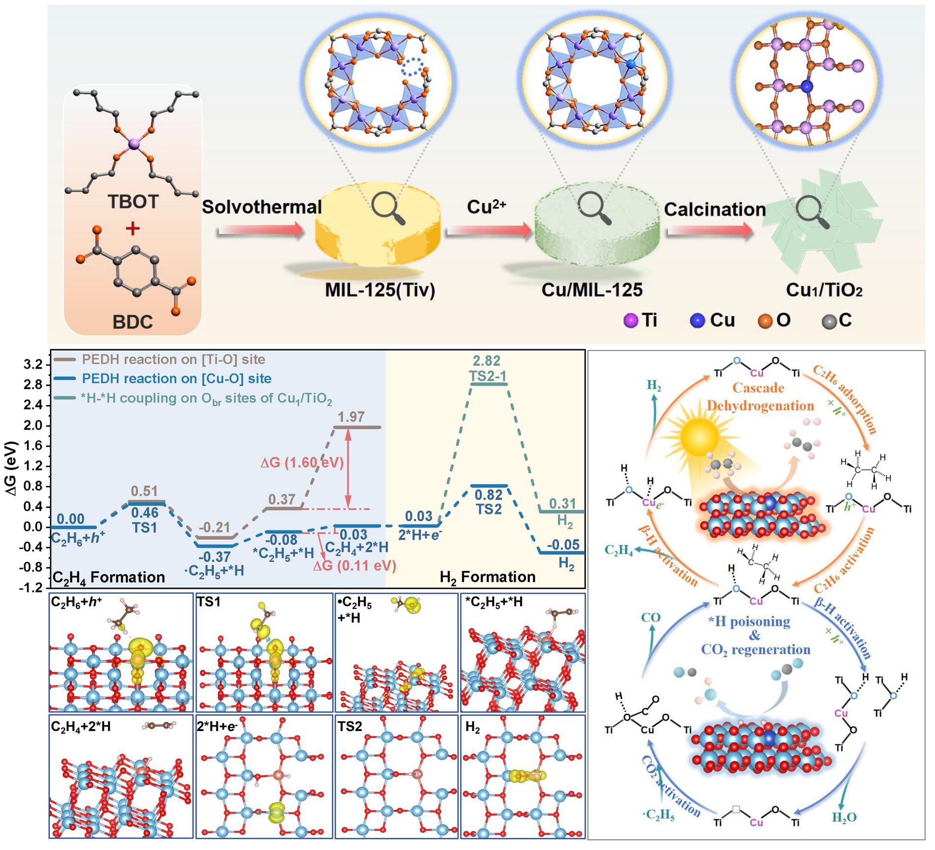 基于此,团队成员构筑了由位点明确的[Cu–O]相邻原子组成的协同活性单元,实现了乙烷向乙烯的高选择性光催化定向转化。在该体系中,Cu的引入促使光生空穴高效局域于与Cu相邻的桥氧位点,从而诱导了乙烷在该桥氧位点的首步C–H活化;Cu位点则接力促进•C2H5中间体中的β–H活化及H2生成,从而构建了空穴管理、逐步脱氢与“保氢”过程协同耦合的定向转化路径。针对非协同位点上表面*H难以脱附、易覆盖活性中心导致失活的问题,研究进一步通过引入CO2构建“自清洁”循环,促进*H的动态清除与[Cu–O]活性位点的持续再生。结合激发态理论计算与基态反应路径的系统对比,研究从理论上揭示了光生载流子的局域化行为,阐明了其在降低C–H活化能垒、促进温和条件下乙烷活化方面的本征优势,为理解光催化烷烃活化的动力学本质提供了重要理论支撑,也为光催化烷烃高值转化提供了新的原子尺度认识。