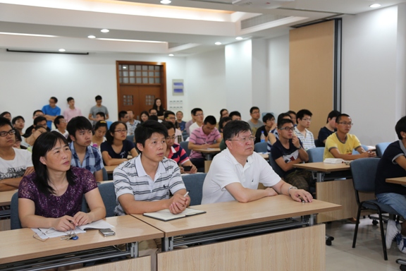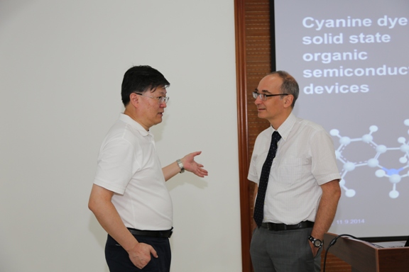 首先,Frank A. Nüesch教授在实验三楼102室为广大师生作了题为“Cyanine dye solid state organic semiconductor devices”的学术报告。曲大辉教授主持学术报告会,田禾院士、朱为宏、朱麟勇、花建丽、解永树、程毅等教授参加了学术报告会。Nüesch教授主要讲述了其课题组在菁染料固态有机半导体器件方面的最新研究进展。菁染料在生物分析检测领域、无机分子离子测定、光学信息存储领域等方面都具有广泛的应用,最近,菁染料也被广泛的用到了半导体、有机太阳电池以及发光二极管的研究中。Nüesch教授发现,改变菁染料的功能取代基团、离子以及菁染料中多甲川链的长度能够显著影响薄膜的形成以及器件性能,因此菁染料在这些领域具有广泛的应用前景。报告后,Frank A. Nüesch教授与参加报告会的师生展开了热烈的讨论与交流。