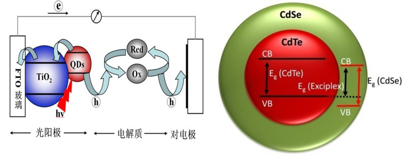 图片说明:左图:QDSC结构示意图;右图:CdTe/CdSe type-II 核/壳结构量子点 高效率太阳电池的开发是最终实现其商业应用的最根本途径。近两年来,钟新华课题组在化学学院田禾院士、花建丽教授的大力帮助下,成功借鉴他们在DSC方面深厚的积累,开发出一种高负载后合成量子点沉积技术,使得预先合成的高质量量子点在QDSC中得以应用,为高效量子点电池开发奠定了基础。该课题组相继设计合成了反转 type-I CdS/CdSe核/壳结构量子点和CdSexTe1-x 合金量子点敏化剂,实现了宽光谱吸收及高效率电子注入的统一,分别取得了5.4% 和 6.4% 光电转换效率,相应成果分别发表在:ACS Nano 2013, 7, 2115-5222; ACS Nano 2012, 6, 3982 -3991; Chem. Commun. 2012, 48, 11235-11237 等期刊上。