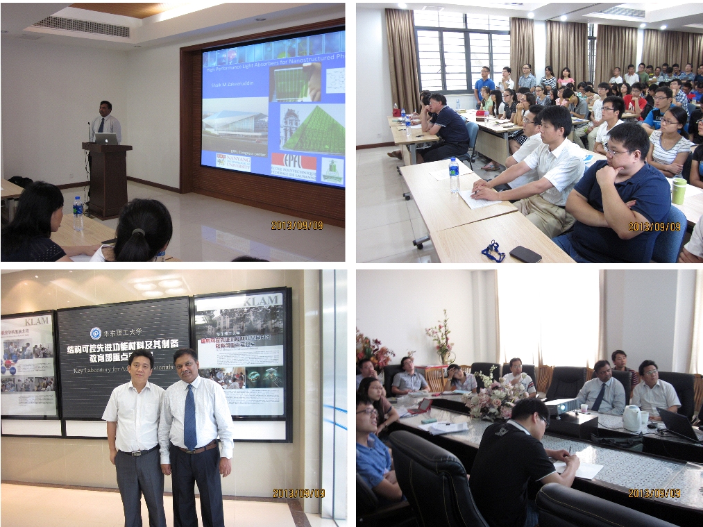 2013年9月7至11日,瑞士洛桑理工学院(Ecole Polytechnique Fédérale de Lausanne EPFL) Shaik M. Zakeeruddin博士应化学与分子工程学院朱为宏教授的邀请,在化学与分子工程学院进行短期讲座交流,授课4次,共16学时,授课的题目为有机太阳能电池敏化染料。