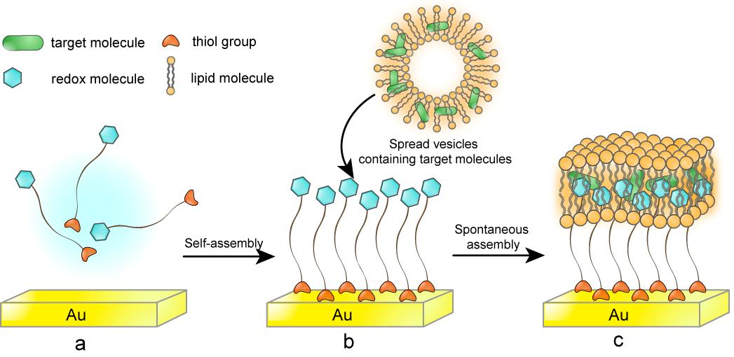 电子传递是生命现象的本质,与生命活动的能量转换、物质输送、代谢调节、细胞识别和信息传递等过程密切相关。而细胞中重要的生化过程,例如细胞呼吸的氧化磷酸化中偶联ADP磷酸化,生成ATP的电子传递过程就发生在细胞膜上。因此,研究与生物膜相关的电子传递机理对于揭示生命过程的本质十分重要。然而,天然生物膜复杂的细微结构和其独特功能使得对生物膜的直接研究仍然是一个巨大挑战。该文章系统地介绍了构建电活性生物分子(redox molecules)自组装单层膜和嵌入电活性生物对(redox and target molecules)的仿生磷脂双层膜的方法,及研究电子传递过程的电化学测试方法。同时,文章详述了利用电化学阻抗光谱(EIS), 高分辨的X-射线光电子能谱 (XPS) 和原子力显微镜 (AFM)表征该仿生膜的形成过程的实验方法。该工作是在研究仿生膜体系中呼吸链初始阶段的泛醌和NADH(还原型烟酰胺腺嘌呤二核苷酸)之间电子传递过程的基础上(J. Am. Chem. Soc. 2011, 133, 12366-12369.),通过构建广泛生物意义上的电活性生物对嵌入的仿生膜体系,模拟研究生物膜相关的电子传递过程,为研究生命体内重要的生物氧化还原机制提供新思路和通用型的研究方法。
