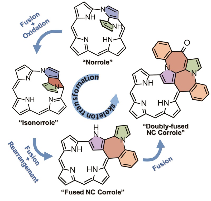 卟啉具有四吡咯大环结构,广泛存在于叶绿素和血红素等自然界功能体系,具有突出的光电特性。近年来,发展具有新颖结构与性能的新型异卟啉,引起了研究者们的广泛关注。其中,关于异卟啉大环之间转化反应的研究有助于发展新型异卟啉骨架,从而进一步拓展结构与性能,具有重要的价值。据介绍,吡咯单元之间错位连接的错位卟啉可用于阴离子识别、功能超分子组装、稳定高价态金属离子及近红外发光等领域。解永树教授在该领域前期系列研究基础上,发展了一种异卟啉大环的新颖转化策略,通过多重骈环作用,高效调控大环转化反应,并调控其光谱特性。基于该方法,研究者可进一步设计、合成具有独特结构与性能的新颖异卟啉,从而应用于新型光电功能体系的构建。