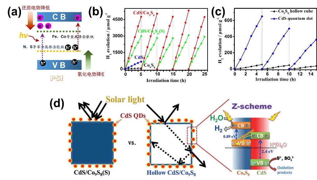 最近,该研究团队在前期工作的基础上,利用Co9S8导带位置较高且电子还原电势大的优点,充分结合空心结构的“光多次反射”效应优势,首次以空心Co9S8为PSI半导体构建了纯固态“无介体”的人工光合作用杂化体系。通过将CdS量子点负载在Co9S8空心立方体的表面,一步构建了“无介体”Z型光催化体系。在没有介体的情况下,CdS与Co9S8之间强的界面作用力,促进了CdS导带电子向Co9S8价带的转移,有效抑制了光生电荷逆反应的发生,提高了催化剂的活性与稳定性。与空白Co9S8及CdS量子点相比,Z体系模拟太阳光下的产氢效率分别提高了134倍与9.1倍,稳定性更是大大增强(如图1b,c所示)。与实心结构相比,光子更容易在空心Z体系的空腔内壁发生多次反射(图1d),从而大大提高了光能的利用率,产氢效率提高了近70%。这种基于Z型反应和空腔结构提高光催化反应活性的策略有望推动可穿戴光电设备和大型太阳能设备的开发与应用。