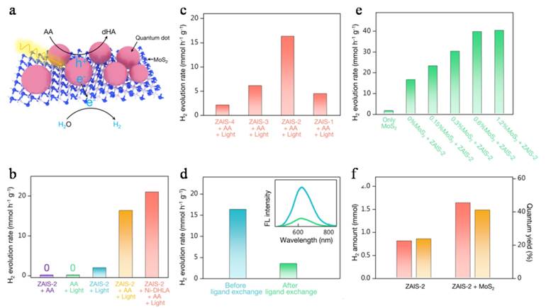 在光催化界面中如何有效的吸收光能并实现高效的光生载流子的分离与利用是光电界面化学研究领域的重要挑战之一。研究者合成了一种高量子产率的Zn-Ag-In-S(ZAIS)量子点,以谷胱甘肽作为表面配体提高了该量子点在宽pH范围水溶液中的稳定性,并通过调控合成过程中阳离子的成分有效的降低其缺陷浓度。通过量子点表面的配体交换证明了谷胱甘肽配体对于提高量子点稳定性及其光催化效率的重要性。该研究团队进一步制备了一种量子点-MoS2复合材料,由于ZAIS量子点与MoS2之间能级的匹配关系,实现了光生载流子从量子点到MoS2的有效传递,加之MoS2的共催化作用,进而大幅度的提高了光催化效率,在400 nm的量子效率也从23.4%提高到了41.0%。该工作发挥不同维度纳米材料的特性优势,取长补短,有效提高催化能力,为新型纳米材料的制备,及其在光催化水分解与二氧化碳还原等研究应用提供了参考。