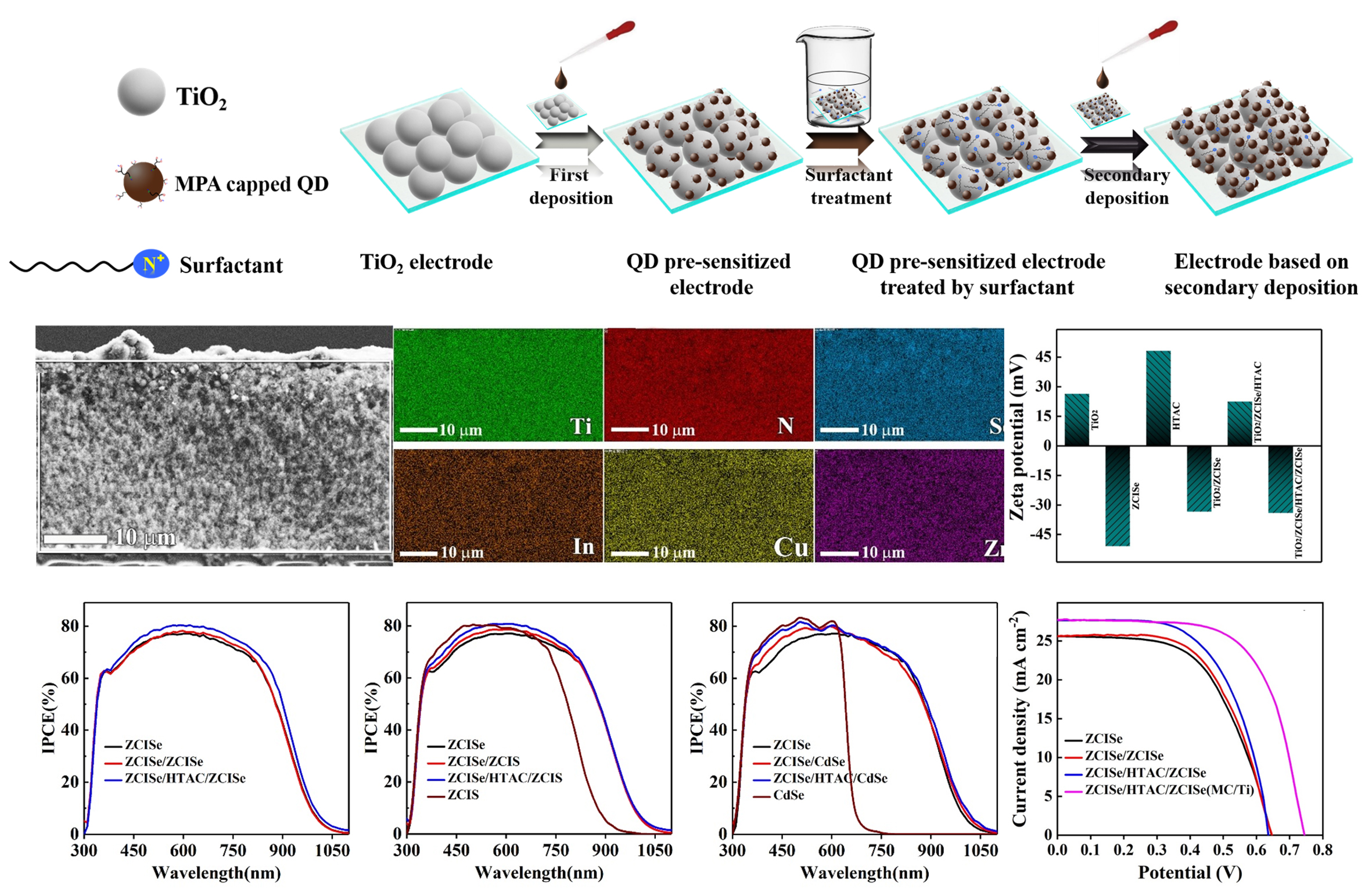 近日,365英国上市集团官网化学院在量子点敏化太阳能电池研究领域取得重要进展,相关研究成果“Facile Secondary Deposition for Improving Quantum Dot Loading in Fabricating Quantum Dot Solar Cells”被国际学术期刊《J. Am. Chem. Soc.》报道。(原文链接:https://pubs.acs.org.ccindex.cn/doi/abs/10.1021/jacs.8b10901) 365英国上市集团官网为唯一通讯单位,博士生王伟和硕士生赵连靖为共同第一作者,李艳副研究员为通讯作者。 捕获太阳光子是光电转化的第一步,也是最重要的一步。对于量子点敏化太阳能电池(QDSC)来说,提高量子点光捕获剂在介孔二氧化钛膜内的负载量,无疑是提高该类器件对太阳光利用效率最直接有效的方式。基于这一思想,在前期多组分量子点共敏化光阳极制备的基础上(Adv. Mater. 2018, 30, 1705746),我们继而构建一种更为简便有效的在介孔二氧化钛膜内高密度负载量子点敏化剂的新方法。利用阳离子表面活性剂处理预先沉积量子点的TiO2膜,改变其表面的zeta电位,并在该预沉积膜内再次引入量子点。这种采用阳离子表面活性剂辅助的“简单二次沉积”方法,不仅实现量子点在光阳极膜内的高密度负载,而且使预先合成的各种高质量胶体量子点负载在同一光阳极膜上成为可能。基于Zn-Cu-In-Se量子点敏化剂,实现组装的QDSC光电流密度超过27 mA/cm2,结合Cu2S/铜片对电极获得了10.26%的认证效率;采用MC/Ti对电极获得了最高13.50%的光电转换效率。该方法的建立大大提高了量子点光捕获剂在光阳极内的负载量,为构筑高效全固态QDSC打下了坚持的基础。