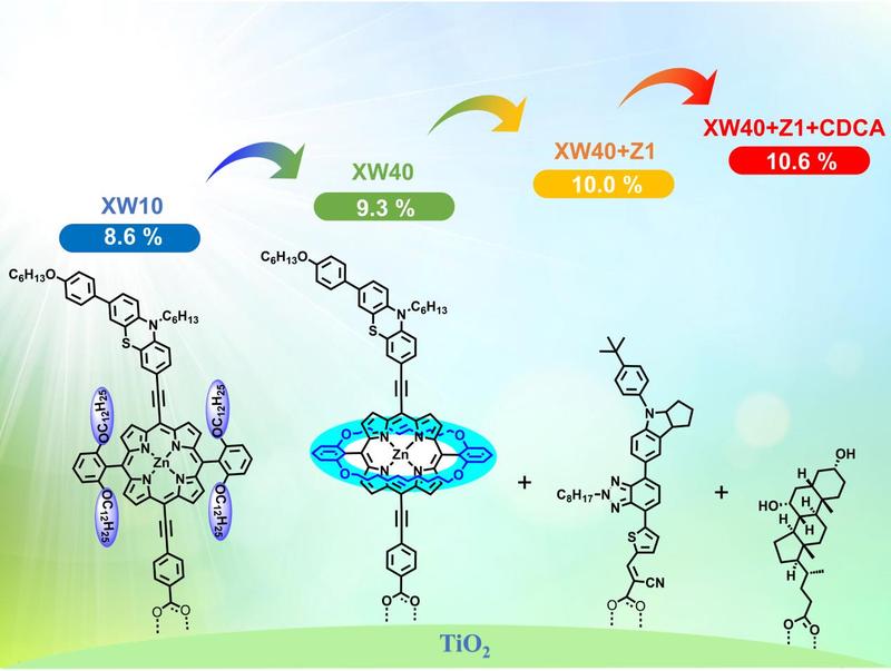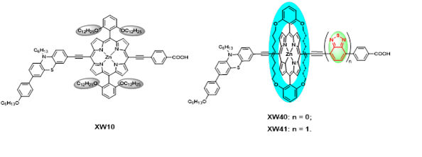 为应对能源危机和化石燃料造成的环境污染,各类太阳能电池研究受到广泛关注。其中,染料敏化太阳能电池具有制备简便、成本较低和光电转换效率较高等优势,近年来取得长足发展。最近,365英国上市集团官网解永树教授团队在卟啉类染料敏化太阳能电池领域取得突破性进展,相关研究成果被国际知名化学期刊Chemical Science以“Efficient solar cells sensitized by a promising new type of porphyrins: dye-aggregation suppressed by double strapping”为题进行了在线报道。 卟啉染料是一种重要的太阳能电池敏化剂。针对卟啉大环的严重聚集等问题,研究团队创新性地将传统的长碳链包裹型卟啉改为“捆扎”式碳链包裹,合成了新型卟啉染料XW40和XW41,从而更有效地抑制染料聚集和电子复合,延长电子寿命及电荷收集效率,提高电流、电压。相比于十二烷氧基包裹的卟啉染料,XW10和XW41在抑制染料聚集的同时提高了染料的吸附量,开路电压和短路电流分别由711 mV和17.90 mA cm-2提高到730 mV和18.67 mA cm-2,从而将光电转化效率从8.6%提升至9.3%。为进一步拓宽染料的吸收光谱,研究团队引入具有吸电子能力的苯并噻二唑基团(BTD)作为辅助受体,合成了染料XW41。BTD的引入有效增强了染料在近红外区的吸收,单色光电子转换效率(IPCE)谱图吸收带边红移达到了830 nm,再采用共敏化和共吸附相结合的策略,开路电压和短路电流同时得到了提升。最终,光电转化效率提高至10.6% (XW40)和10.2% (XW41)。该研究成果为设计合成高效卟啉染料提供全新思路,而且丰富、发展了卟啉合成化学。