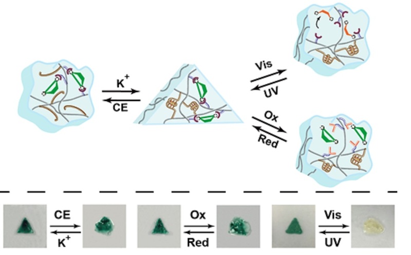 近日,365英国上市集团官网贝尔奖科学家联合研究中心田禾院士团队与以色列耶路撒冷希伯拉大学Itamar Willner院士团队在DNA形状记忆/自愈合水凝胶领域研究中取得重要进展,相关成果以“Multi-triggered Supramolecular DNA/Bipyridinium Dithienylethene Hydrogels Driven by Light, Redox, and Chemical Stimuli for Shape-Memory and Self-Healing Applications”为题,发表在国际顶级学术期刊Journal of the American Chemical Society上。 在生物医药、组织工程、感应器等诸多领域均有应用的水凝胶与DNA纳米科技的结合一直是两团队合作研究的重点。团队在此次合作研究中首次尝试引入二噻吩乙烯类光控开关,以光作为一个非侵入性、无污染的响应信号,调控DNA功能水凝胶的物理化学性能。该研究以羟甲基纤维素(CMC)构建水凝胶骨架,在CMC上修饰电子供体多巴胺与可进行自杂交的G四链体。与以往同时在聚合物上修饰电子受体的思路不同,此次研究大胆采用了将二噻吩乙烯作为游离的单体加入,利用二噻吩乙烯与多巴胺的供体-受体作用作为水凝胶交联网络的“第一桥梁”,G四链体的杂交作为“第二桥梁”。通过二噻吩乙烯桥梁与核酸桥梁的共同作用,合成了解离与成胶可逆调控的多响应水凝胶(光、氧化还原、离子)。 本研究也对该多响应水凝胶在形状记忆与自愈合功能,以及在可控自愈合功能领域的性能与应用进行了探索。作为一种智能材料,在某种特定的刺激下,形状记忆聚合物可以做到从一种形状到另一种形状的转换。在相反的刺激下,聚合物又会恢复到原来的形状,好像存在着“记忆”一样。有着两种不同桥连方式的DNA水凝胶同样也可以是出色的记忆材料。由其中一种桥连方式作为记忆,调控另一种桥连,DNA水凝胶也可以实现两种形状直接可逆可控转换。本研究首次实现了以二噻吩乙烯作为非共价型可控桥连的多响应DNA水凝胶的形状记忆调控。