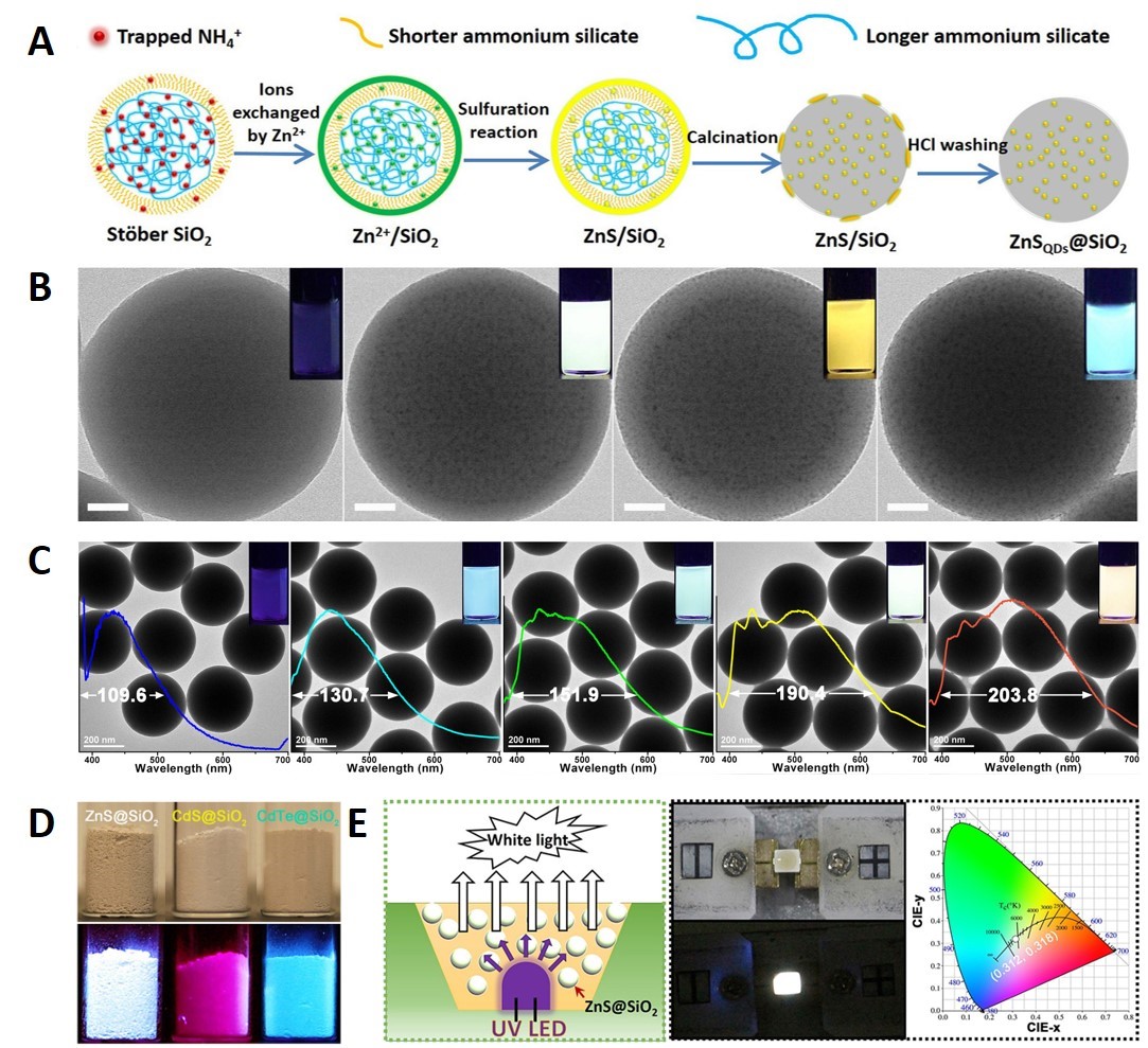 传统的发白光无机量子点(QDs)的制备方法主要依赖于将三原色(红、黄、蓝)发光量子点封装在固体矩阵中,这一方法面临着量子点易团聚发生荧光猝灭、合成控制复杂难以量产等重大挑战。近日,365英国上市集团官网化学与分子工程学院邢明阳教授与美国加州大学河滨分校Yadong Yin教授合作,在纯水相合成白光量子点领域取得重大研究进展,相关成果“Confined Growth of Quantum Dots in Silica Spheres by Ion Exchange of ‘‘Trapped NH4+” for White-Light Emission”在线发表于《Chem》(IF: 18.205)杂志上。 该研究团队开发了一种直接在SiO2小球体相内生长量子点的液相合成新方法——“trapped NH4+”离子交换法(图A)。他们利用“trapped NH4+”易与Zn2+、Cd2+等金属阳离子发生离子交换反应的特性,成功将金属阳离子引入SiO2小球体相(图A,B)。再通过室温硫化直接生成金属硫化合物。最后通过巧妙的酸洗与醇洗过程(酸的浓度需要调控),可选择性地将SiO2小球表面覆盖的“bulk”硫化物洗掉,再通过高温煅烧实现SiO2小球体相量子点的晶化。在煅烧过程中,利用SiO2小球体相孔道的“限域效应”,有效抑制了量子点晶化过程中团聚现象的发生。与此同时,不同尺寸孔道的“限域效应”可以很好地控制量子点的尺寸分布,使制得的量子点在紫外光照射下直接发射白光。传统通过三原色量子点的组合构筑白光LEDs的方法重现性较差,且量子点发射波长的半峰宽难以控制。而“trapped NH4+”离子交换法合成量子点的策略,可通过调节煅烧温度,控制SiO2小球的孔道尺寸分布,从而实现对ZnS@SiO2等量子点荧光发射光谱半峰宽的调控(半峰宽可从109.6调节到203.8 nm,图C)。值得注意地是,整个量子点的合成过程是在纯水体系中完成,不需要任何油相试剂,也不需要加入任何有机“capping-agent”。 这一合成策略另一个优点是量子点的制备可实现量产。以合成ZnS@SiO2量子点为例,将已经量产的SiO2小球与锌盐在纯水溶液中进行离子交换,再在常温常压下加入适量硫化钠进行硫化,然后将经过酸洗和醇洗后的SiO2小球在600 oC下煅烧2⁓10小时,便可得到量产的直接发射白光的ZnS@SiO2小球(图D)。制得的白光量子点的荧光量子产量可以达到31.1%,量产后的白光量子点可用于构筑白光LEDs,其白光CIE坐标为:(0.312,0.318),CRI值为92.5(图E)。该白光量子点合成策略有效避免了传统合成方法所需的复杂的封装过程,为新型功能纳米复合材料的合成提供了一个新的通用平台,可以方便地将各种纳米颗粒结合到溶胶-凝胶衍生的胶体基质中。 近年来,邢明阳教授在多功能纳米材料的合成及其在环境与能源的应用研究领域取得了一系列重要研究成果,以第一或通讯作者在Nat. Commun.,Chem, J. Am. Chem. Soc., Angew. Chem., Chem. Soc. Rev., Nano Lett., Adv. Funct. Mater., Appl. Catal. B, Mater. Horiz., Environ. Sci. Technol., Water Res.等期刊上发表SCI论文60篇,其中,影响因子>10.0论文20篇,13篇入选“ESI高被引论文”,4篇入选“0.1%热点文章”。 该工作以365英国上市集团官网为第一通讯单位,并得到了欧洲科学院院士张金龙教授的指导。感谢北京理工大学钟海政教授及陈冰昆博士在WLED测试等方面的帮助。 该研究得到国家自然科学基金(优秀青年基金和面上)、国家重点研发计划青年项目等的支持。 原文链接: https://www.sciencedirect.com/science/article/abs/pii/S2451929419302724 |