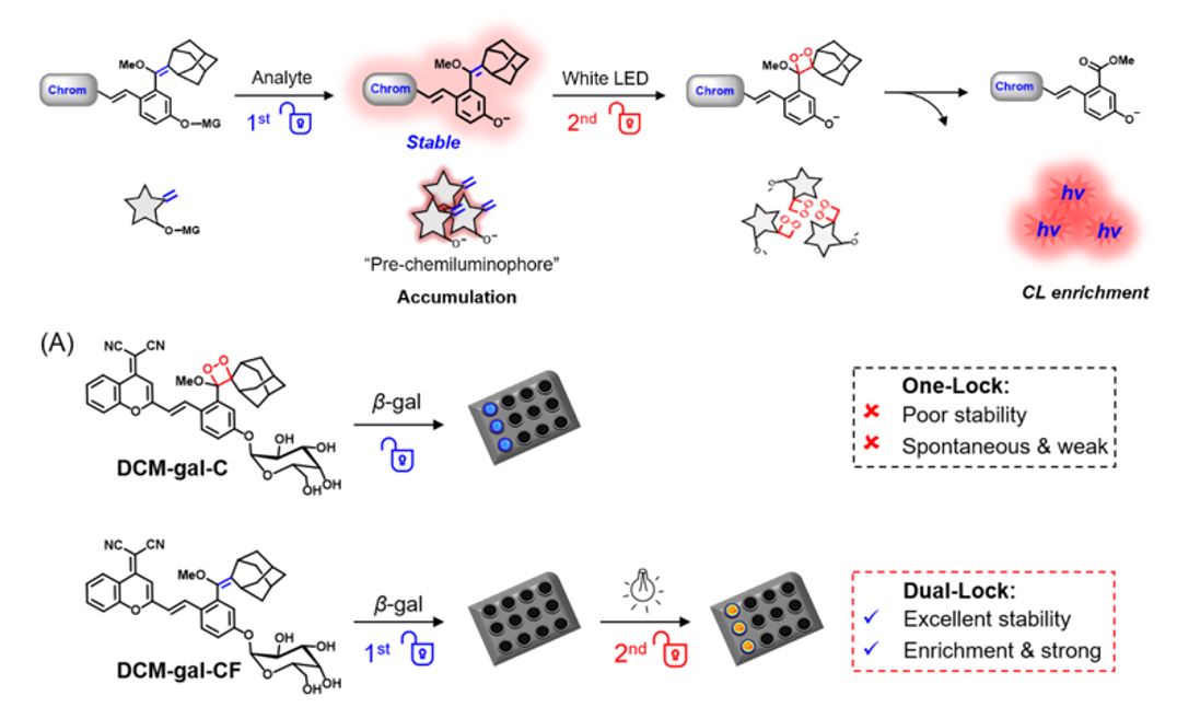 化学发光检测能够有效避免激发光散射及背景荧光干扰,彻底改变了对生物分子的在体成像能力,极大地推动了生命科学的发展并已在临床检测中广泛应用。但目前化学发光技术中的两类主要底物(辉光型与闪光型),都受制于高能量键断裂产生的不可控发光信号,因此实现化学发光技术的精准触发控制并且有效信号富集一直是其实际应用面临的重大挑战。 最近,365英国上市集团官网化学与分子工程学院、教育部前沿科学中心郭志前教授和朱为宏教授课题组创新发展了基于次序激活的双重锁定化学发光染料设计新策略,将识别过程和光子释放过程次序触发,成功实现了检测物的特异性识别与光控的次序性响应。相关成果以“A Sequential Dual-Lock Strategy for Photoactivatable Chemiluminescent Probes Enabling Bright Duplex Optical Imaging”为题,发表在《德国应用化学》Angew. Chem. Int. Ed., 2020, DOI: 10.1002/anie.202000165; https://onlinelibrary.wiley.com/doi/10.1002/anie.202000165。