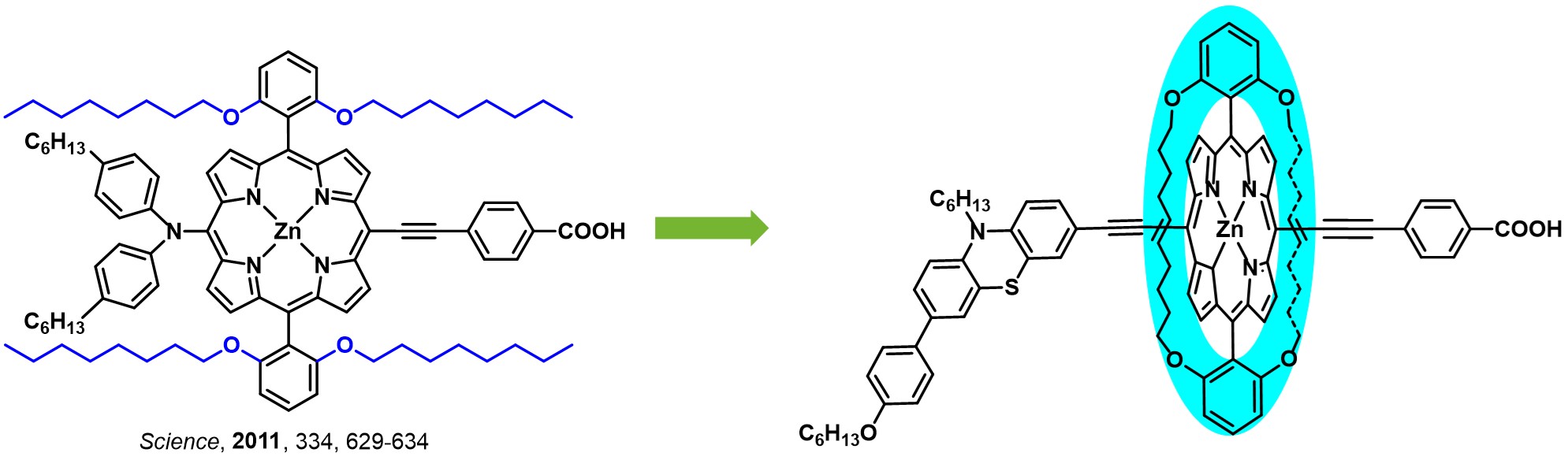 为进一步提升光电性能,在传统开链围阻型卟啉结构基础上,创新性地设计合成出独特的“闭环屏缚”型卟啉结构,在卟啉环周围引入环型碳链,更为有效地抑制了染料分子间的聚集作用,同时提升染料吸附量,从而同时实现了电池开路电压、短路电流和光电转换效率的提升 (Chem. Sci., 2019, 10, 2186; J. Mater. Chem. A,2019, 7, 20854)。
