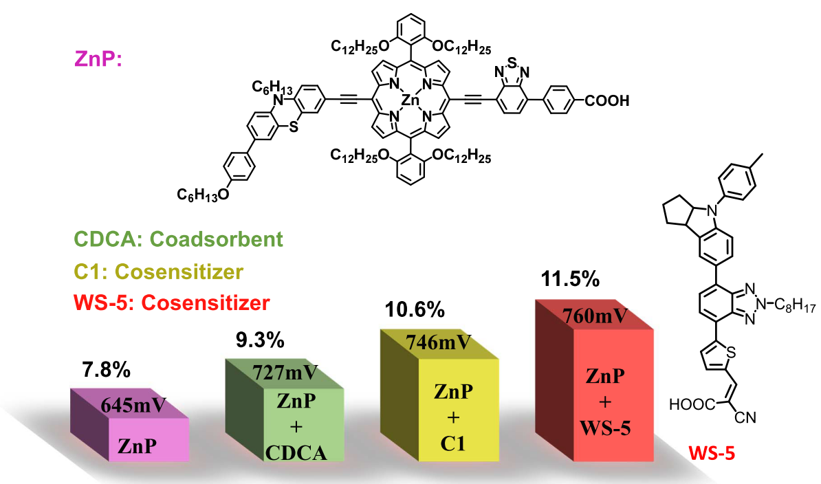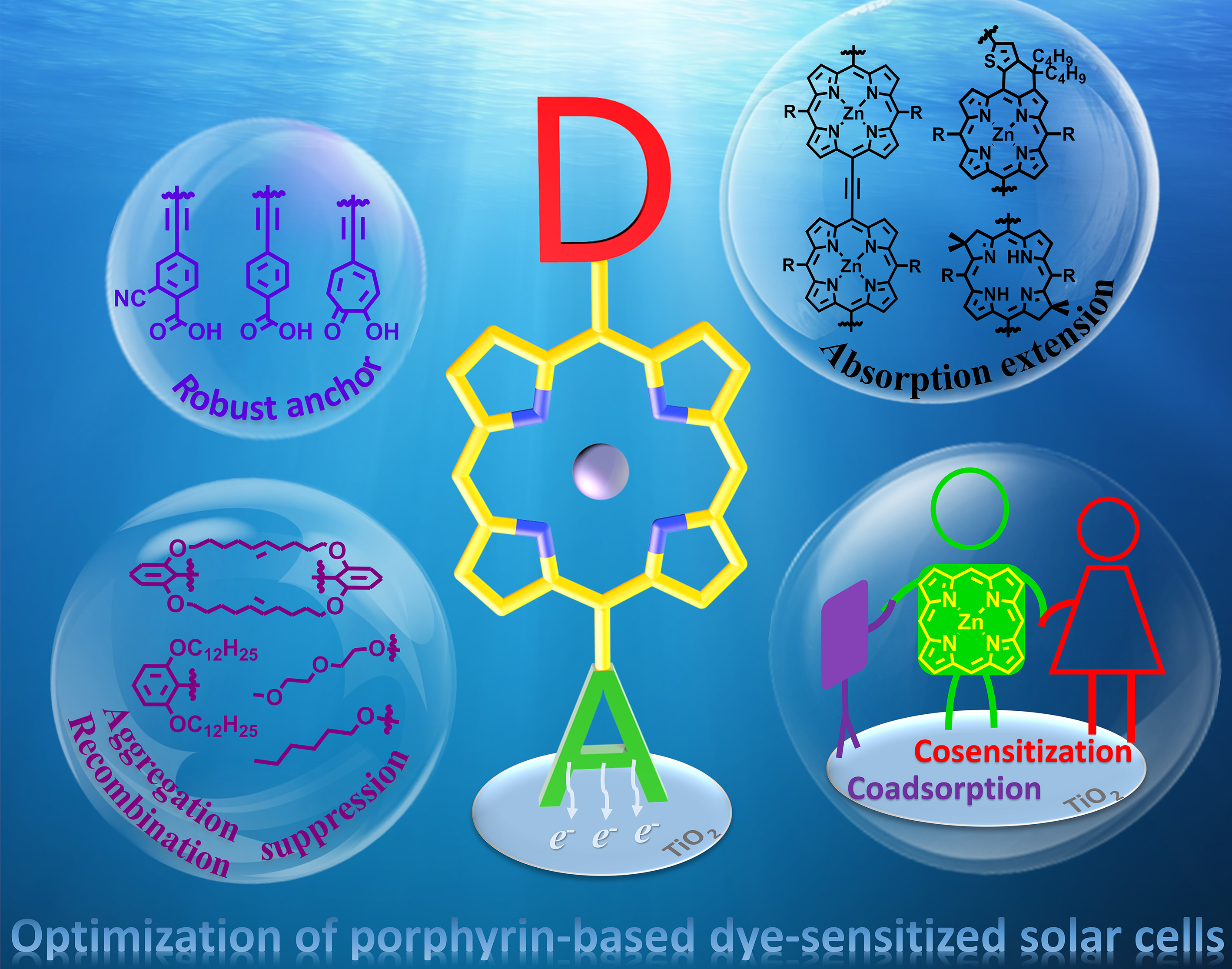 基于上述系列研究成果,解永树教授课题组近期应邀于 Energy & Environmental Science发表综述,全面介绍了卟啉类染料分子结构的系统优化、共吸附、共敏化及“协同伴侣”染料等最新研究进展,并对该领域有待进一步改进的问题、发展方向和发展前景进行了展望。