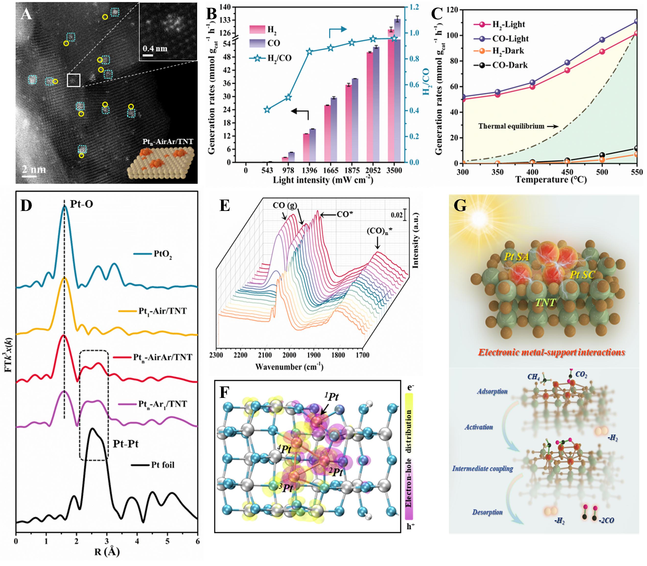 基于上述背景,张金龙教授团队运用离子交换和空间限域策略,对TiO2纳米管上的Pt位点进行原子级调控,诱导局部电荷重排,促进了反应物分子在活性位点的定向吸附与活化,在光驱动下实现了高效稳定的甲烷干重整。其中,该团队构筑的Pt单原子 (SA) Pt亚纳米团簇 (SC) 共修饰样品Ptn-AirAr/TNT(图A),在光驱动DRM反应中表现出高达34.41 mol gPt-1 h-1的合成气生成速率和接近1:1H2/CO,打破了传统热催化的局限性(图B-C)。该研究凭借X射线吸收光谱(XAFS)、原位红外漫反射光谱(DRIFTS)及激发态计算等先进表征手段,深入解析了不同Pt位点修饰样品中电子-金属-载体之间的相互作用(图D-F)。研究表明,单原子和团簇的特殊结构所诱导的界面电荷重排和电子金属-载体相互作用增强了反应物及中间体转化,Pt SAPt SC合适的距离促进了C=O偶联,有效抑制了副反应,促进了H2CO的高效稳定生成(图G)。该工作阐明了活性位点与界面态调控在DRM反应中的重要作用,为在原子尺度上探究多分子反应体系提供了指导。