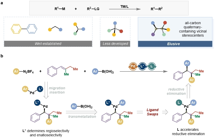 发展催化不对称合成方法构建手性Csp3立体中心在有机合成中具有重要意义。过渡金属催化的交叉偶联反应被认为是构建手性C−C键的简单高效的方法之一。早期交叉偶联反应的研究主要集中于两个不同芳环之间的直接偶联反应,构建的是平面型的二芳基化合物。近年来,过渡金属催化的不对称偶联反应已经成为了构建各类Csp3立体中心最为直接有效的策略之一,并被广泛用于天然产物和药物分子的合成中。然而,利用过渡金属催化的分子间的不对称偶联反应构建全碳季碳中心仍然存在巨大的挑战,目前含全碳季碳的连续手性中心的不对称偶联反应鲜有报道。
