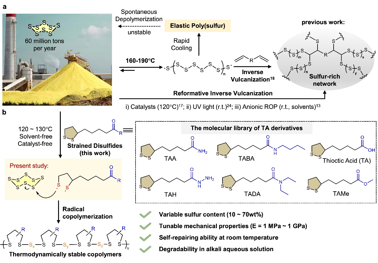 硫是地球上储存量排名第五的元素,八元环状硫单质具有独特的结构与化学稳定性,广泛分布于自然界中。随着石油工业的发展,作为石油化工下游产物的单质硫产量逐年上升,现如今已达到6000万吨/年。目前单质硫的消耗量与产量严重不匹配,单质硫常作为橡胶工业中的橡胶硫化剂使用,但年消耗量有限。因此以单质硫为原料制备生产具有经济价值与实际应用的商品,尤其是塑料,具有重要的意义。通过“逆硫化”反应,即高温条件下单质硫与烯烃分子发生共价交联反应,可获得一系列共价交联聚合物材料,但该类反应往往需要引入金属催化剂、光照条件或者阴离子诱导聚合等手段,经济效益较低且力学性能无法满足实际应用。除此之外,单一的共价开环聚合反应不能得到具有力学性能和实际应用价值的高分子材料,这是由于聚硫高分子在热力学上不稳定,平衡倾向自发形成单质硫单体。