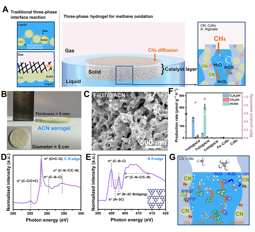 近日,365英国上市集团官网化学与分子工程学院王灵芝教授和张金龙教授课题组在光催化甲烷转化领域取得最新研究进展。研究成果以“Photocatalytic Conversion of Methane to Ethanol at a Three-Phase Interface with Concentration-Matched Hydroxyl and Methyl Radicals”为题,发表在《Journal of the American Chemical Society》上。 利用光催化技术将CH4选择性地氧化为含氧化合物,是一项极具吸引力但也充满挑战的任务。由于CH4高度惰性、溶解度及气体扩散系数低,通常利用高压提高粉末悬浮光催化体系中活性氧自由基 (ROR) 的浓度,促进CH4活化。但由于生成的含氧化合物比CH4更易氧化,导致难以实现转化率和选择性的双赢。虽然目前已经有一些策略成功地实现了高转化率及抑制过氧化,但高压环境仍然对选择性调控造成了较大限制。例如,虽然已有众多体系实现了CH4选择性转化制CH3OH,但两个或更多碳原子醇(C2+)的生产仍鲜有报道。进一步提升压力通常导致CH3OH进一步氧化成HCHO和HCOOH。推测是由于相比碳正中心自由基,高压体系中容易形成过量的ROR,而ROR对C2+醇中的C–C键较强的亲核进攻倾向,导致CH4氧化反应最终以C1产物为主。 基于此,该团队围绕如何形成浓度相当的•CH3与•OH,设计了基于三相界面漂浮膜策略的CH4选择性制C2H5OH光催化体系。在前期利用水凝胶的动态收缩−回弹行为促进芬顿反应中金属离子价态的可逆转换的研究基础上 (Chem. Mater.2024, 36, 7, 3316),结合冷冻干燥和金属离子交联策略,构建了包埋C3N4的Fe(III)-交联的大孔海藻酸盐水凝胶膜 (Fe(III)@ACN)。该凝胶的轻质大孔结构使其可以稳定漂浮在气-水界面,形成气-固-液三相界面,通过缩短气体的扩散路径在常压下促进CH4分子与孔道内部活性物种的接触。光照下,利用Fe(III)@ACN的亲水性在C3N4上发生水氧化反应 (WOR) 产生H2O2;同时,光生电子还原生成的Fe(II)触发了与H2O2之间的Fenton反应生成•OH;三相界面处增强的气体传质有助于CH4与•OH反应生成•CH3,最终在•CH3与•OH浓度匹配的条件下,促进碳链增长,实现从CH4到CH3OH再到C2H5OH的转化。Fe(III)@ACN催化剂在常温常压下表现出优异的活性,醇类选择性达到96%,其中包括90%的C2H5OH。无需添加贵金属的情况下,C2H5OH的生成速率达到171.7 μmol g−1 h−1。