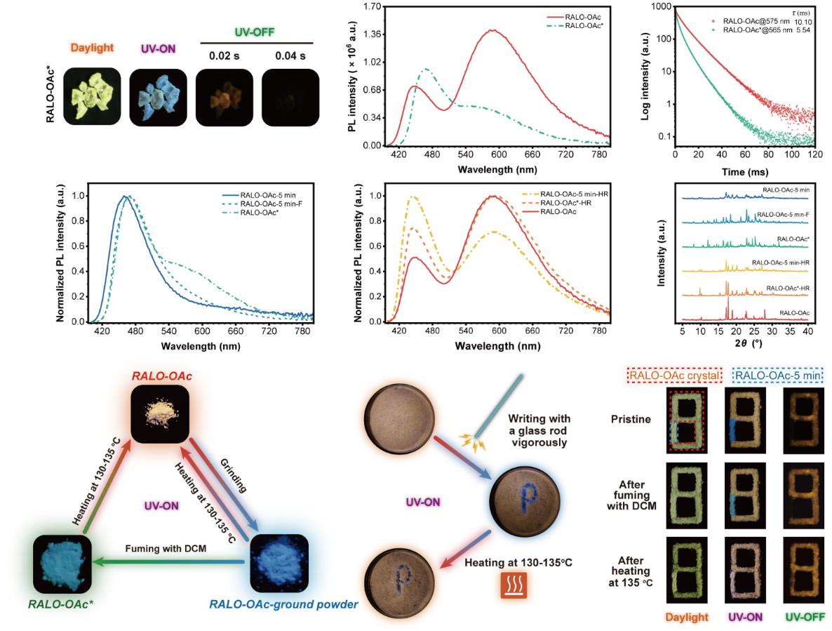 图2.基于RALO-OAc和RALO-OAc*之间晶型互变的多重刺激响应性及其应用示例。