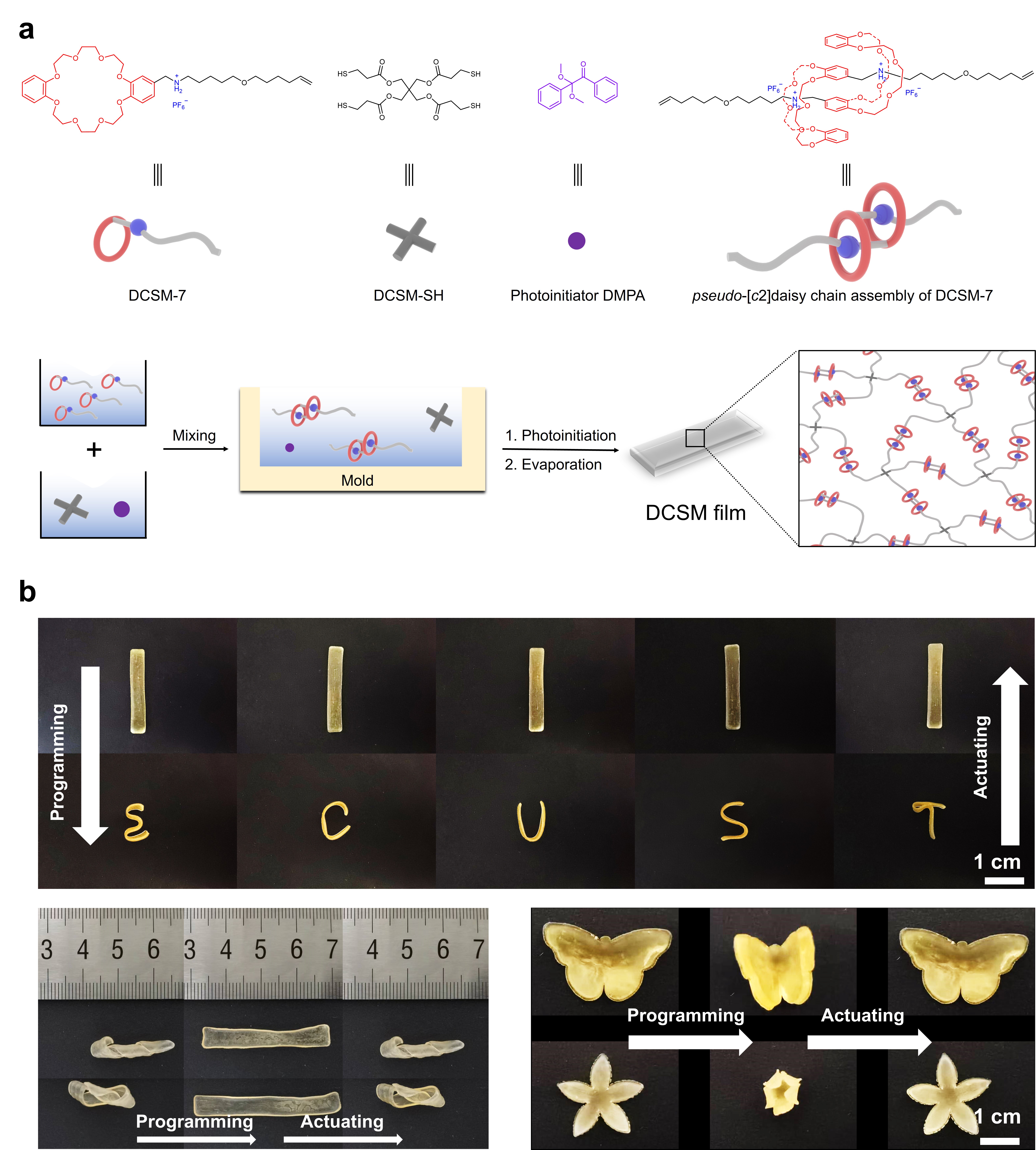 近期,该研究团队以[c2]雏菊链结构作为聚合物网络的动态单元,通过共价交联剂四(3-巯基丙酸)季戊四醇酯单体与[c2]雏菊链机械互锁组装体的光诱导硫烯点击反应构筑了一种超分子形状记忆聚合物DCSM,其表现出优异的形状固定率(Rf)、形状恢复率(Rr)以及形状记忆抗疲劳特性。通过控制温度可形成多种临时形状,并能够在特定的温度下完全恢复至其永久形状。通过对照实验,作者系统研究了基于二苯并24-冠-8的[c2]雏菊链的机械互锁拓扑结构与形状记忆功能的构效关系,发现该类空间互锁结构有助于提高聚合物玻璃化转变温度,这对熵驱动形状记忆效应至关重要。同时,机械互锁拓扑结构极大地提高了聚合网络的机械性能,并显著增强了材料的形状恢复性能和抗疲劳特性,这一发现可为高性能动态智能材料的性能定制提供了重要依据。