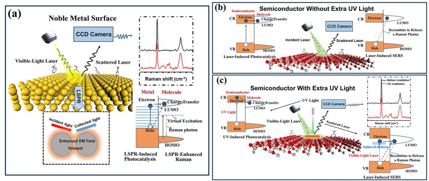 光催化反应过程包括光子吸收和转化、光诱导载流子的分离和迁移、表面自由基和中间体的形成和演变。深入了解这些关键过程对于合理设计光催化体系至关重要。然而,光生载流子的生成和演变通常仅持续飞秒到皮秒级别,导致效率低且选择性调控困难。光催化剂表面存在许多转瞬即逝的、与反应路径息息相关的微量物种,这些物种的捕获与识别需要原位、实时的跟踪技术。虽然已有多种原位、实时表征手段被应用于载流子及其衍生物种的分析,但大多难以实现在真实反应体系中的原位工况条件下的实时监控。 表面增强拉曼散射(SERS)是一种高灵敏的表/界面分子和官能团分析检测技术,可实现气、固、液不同体系的无损检测,并避免了红外光谱中来自水和羟基的常见干扰。传统的SERS检测主要依赖于在可见光区具有强等离子共振效应的Au、Ag基底,虽然灵敏度高,但受到稳定性、循环使用性和价格等因素的限制。近年来,含贵金属的复合材料,如贵金属/半导体以及高灵敏的非贵金属基底,如金属氧化物、金属有机框架材料、石墨烯等,得到了蓬勃的发展。这些材料同时也是常见的光催化体系。通过SERS/光催化体系的相互关联,我们可以通过SERS光谱实时、原位自监测光催化剂表面瞬时、低浓度的表面物种的形成和演变。这为我们提供了在真实工况条件下获取复杂光催化过程中传统低敏手段难以获得的重要信息的机会。 综述文章详细分析了近年来利用SERS实现光催化过程原位、实时监控的相关研究进展,包括光催化反应SERS监控原理、SERS的优势以及目前存在的挑战。重点讨论了如何利用SERS阐明光催化过程的关键信息,包括周围介质对热催化载流子提取的影响、电荷载流子跃迁和转移的方向、光催化活化途径以及区分光热效应和热电子贡献。文章还探讨了尖端增强拉曼光谱(TERS)由于能够实现高空间分辨率测量而带来的好处。