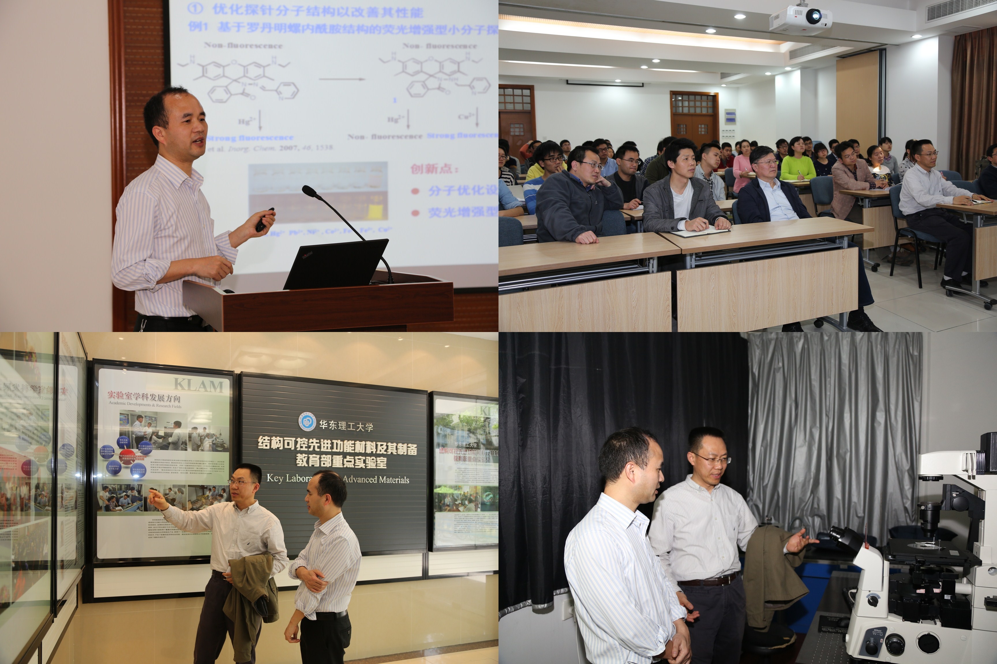 On April 22th, invited by Prof. Tian He, Prof. Zhang Xiaobing (the National Outstanding Youth Fund Owner, from Hunan University) visited our school. Prof. Zhang attended the 146th "Famous Teacher Forum" and gave a lecture titled "Chemical and biological fluorescent probes for the early diagnosis and treatment of disease". Prof. Long Yitao hosted the lecture and Prof. Guo Yanglong, Li Yongsheng, Zhu Weihong, Zhu Linyong, Xie Yongshu also attended the lecture.