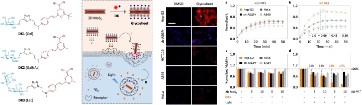 In collaboration with researchers at Shanghai Institute of Materia Medica and Eastern Hepatobiliary Surgery Institute of the Second Military Medical University, Dr. Xiao-Peng He’s group at ECUST recently developed novel 2D “glycosheet” (Adv. Mater. 2016, 28, 9356) and “peptidosheet” (Adv. Mater. 2016, DOI: 10.1002/adma.201604253) materials by the supramolecular assembly between 2D MoS2 and glycoligand- and peptide ligand-based probes, respectively, for the targeted theranostics of cancer. By targeting a glycoligand receptor, the 2D glycosheet showed the ability to selectively produce both fluorescence and reactive oxygen species in liver cancer cells, over control cells without receptor expression. In particular, the 2D peptidosheet that selectively binds to CD47, a membrane protein, has been proven to be amenable to the differentiation between cancer and paracarcinoma tissue with clinical specimens. The latter study also unravels CD47, a membrane protein, as a potential biomarker for the diagnosis of liver and bile duct cancer.