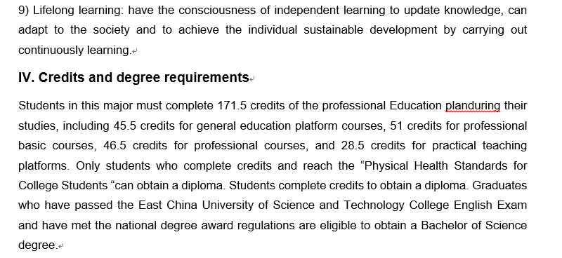 8 credits are required.“Document Retrieval” (1credit) in the information technology module is required. It is recommended to complete 1-2 credits in course modules such as Humanity History, Economic Management, Entrepreneurship Education, respectively.